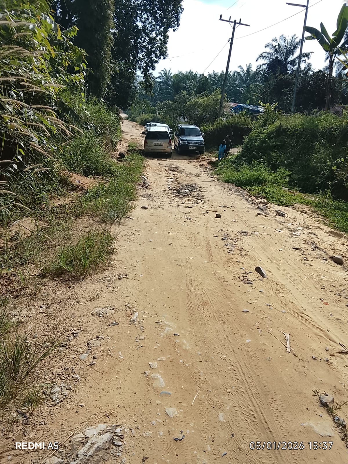 fhoto jalan di Suka Rame yang sudah cukup parah dan sangat sulit dilalui kendaraan roda dua dan roda empat mobil.