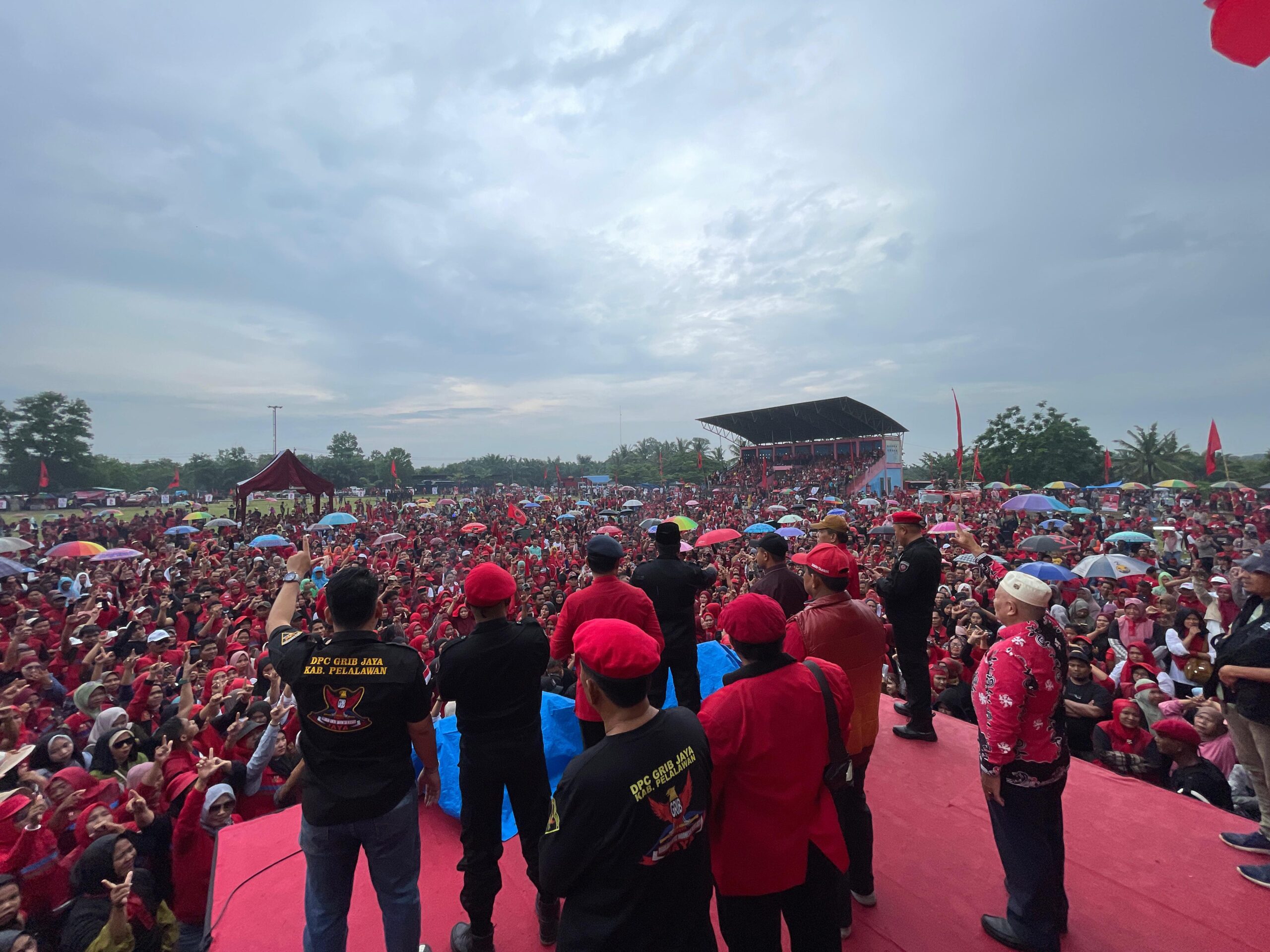 Bandar Petalangan tekab86.com,- Meskipun diguyur hujan deras, ribuan massa menyesaki apel satgas PDI Perjuangan dalam memenangkan Pasangan Calon (Paslon) Bupati dan Wakil Bupati Pelalawan H Zukri-H Husni Tamrin nomor urut 02 di Stadion Abdul Hamid Lubuk Terap, Kecamatan Bandar Petalangan, Sabtu (16/11/2024).
