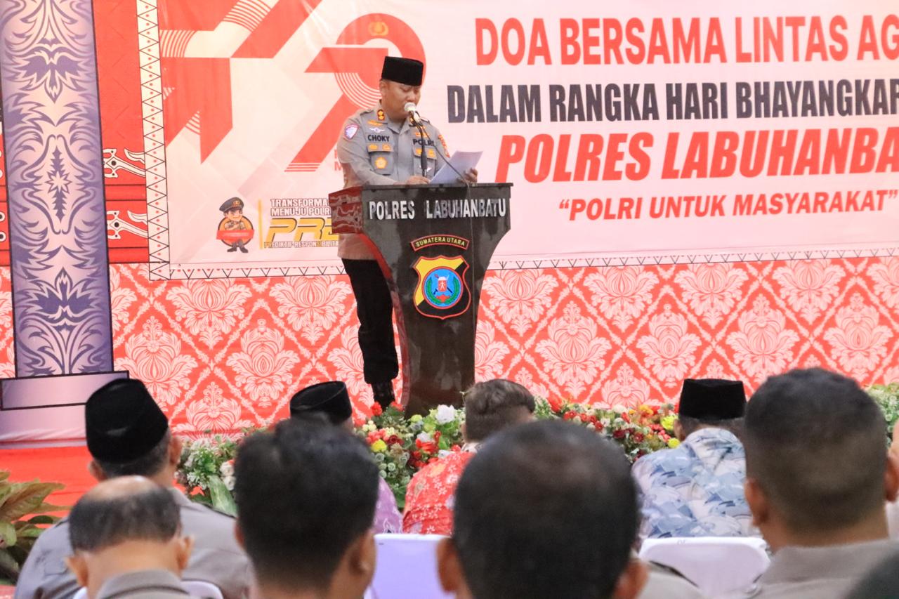 Labuhanbatu(tekab86.com)Dalam rangka memperingati Hari Bhayangkara ke-79, Kepolisian Resor (Polres) Labuhanbatu gelar Doa Bersama Lintas Agama yang pada Senin, 30 Juni 2025, di Aula Yan Piter, Mapolres Labuhanbatu, Rantauprapat Kabupaten Labuhanbatu.