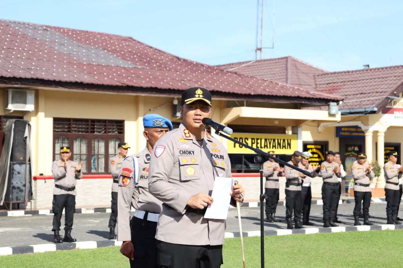 labuhanbatu(tekab86.com) Kapolres Labuhanbatu AKBP Choky Sentosa Meliala, S.I.K.S.H, Pimpin upacara serah terima jabatan (Sertijab) Pejabat Utama dan Kapolsek jajaran Polres Labuhanbatu, Senin (13/10/2025) di halaman apel Mapolres Labuhanbatu, Rantauprapat.