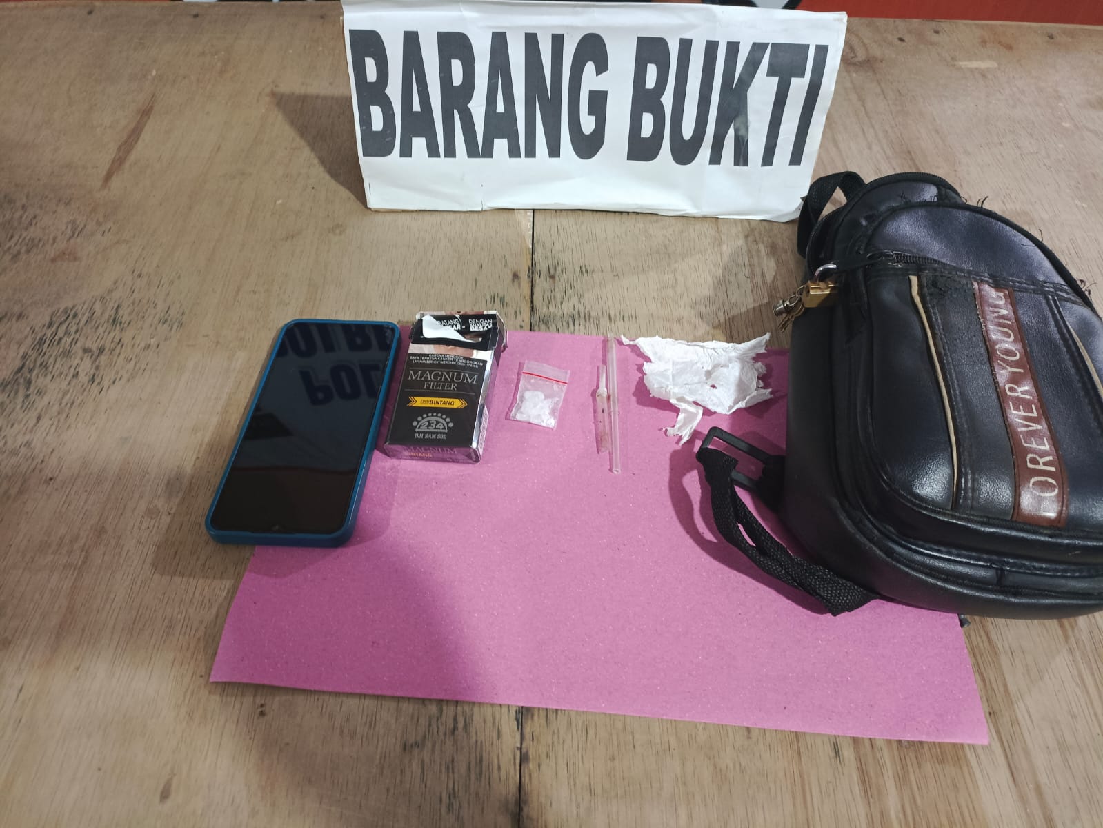 Petugas kemudian melakukan penggeledahan ditemukan dua buah kaca pirex, satu unit handphone merk Oppo warna biru, satu buah tas sandang warna hitam milik tersangka.1 bungkus plastik klip transparan berisi sabu 1,34 gram, 1 bungkus kotak rokok Magnum fter, 1 lembar potongan tisu
