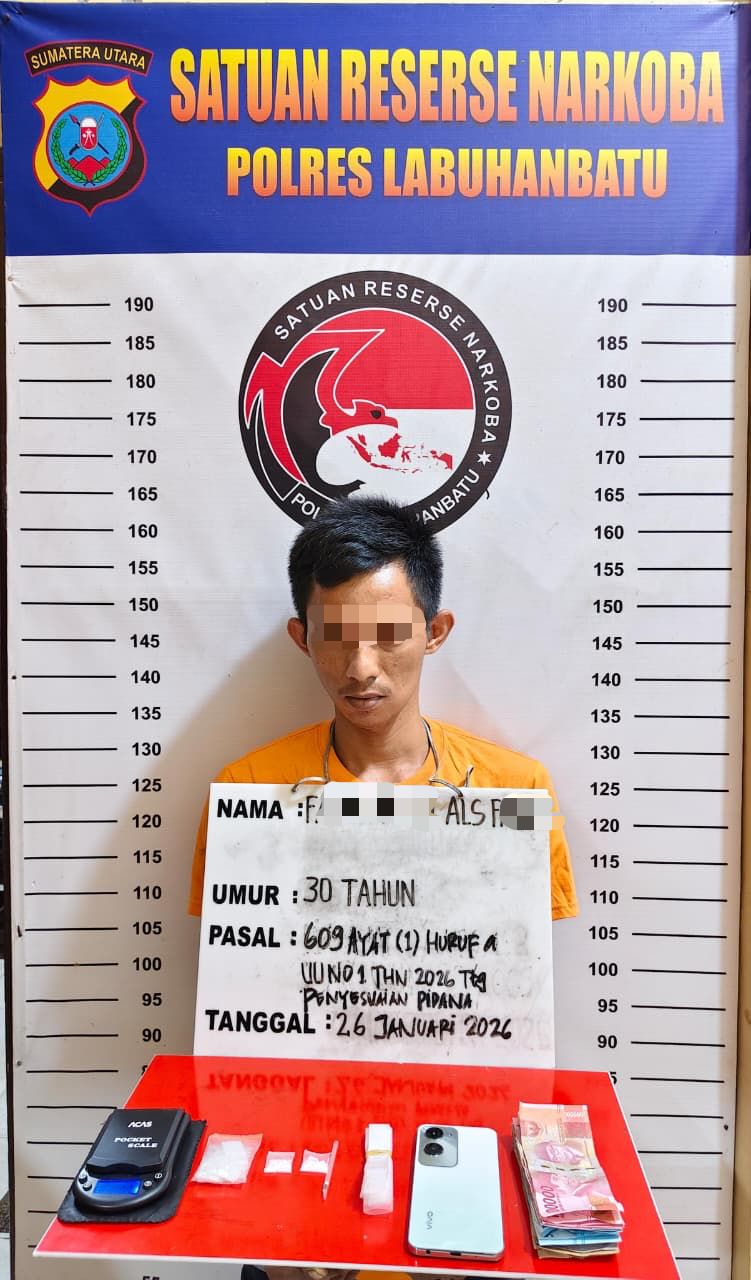 Dilokasi petugas mengamankan seorang laki-laki inisial FA als F (30), warga Desa Kuala Bangka, Kecamatan Kualuh Hilir, Kabupaten Labuhanbatu Utara, diketahui tersangja seorang wiraswasta diduga terlibat dalam kepemilikan serta peredaran narkotika jenis sabu.