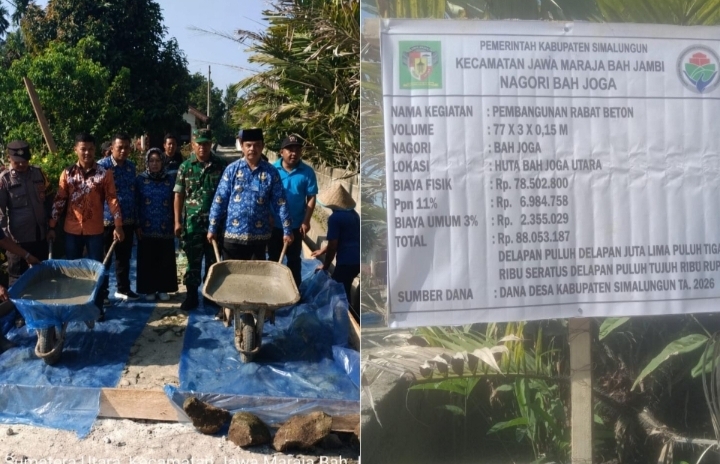 SIMALUNGUN.(tekab86.com) — Semangat gotong royong dan kepedulian terhadap pembangunan desa kembali terlihat di Huta Bah Joga Utara, Nagori Bah Joga, Kecamatan Jawa Maraja Bah Jambi, Kabupaten Simalungun. Sinergitas antara pemerintah kecamatan, Babinsa Koramil 10/Tanah Jawa Kodim 0207/Simalungun, Bhabinkamtibmas, serta pemerintah nagori tampak solid dalam kegiatan uji trail pembangunan jalan perkerasan beton yang bersumber dari Dana Desa Tahun Anggaran 2026.