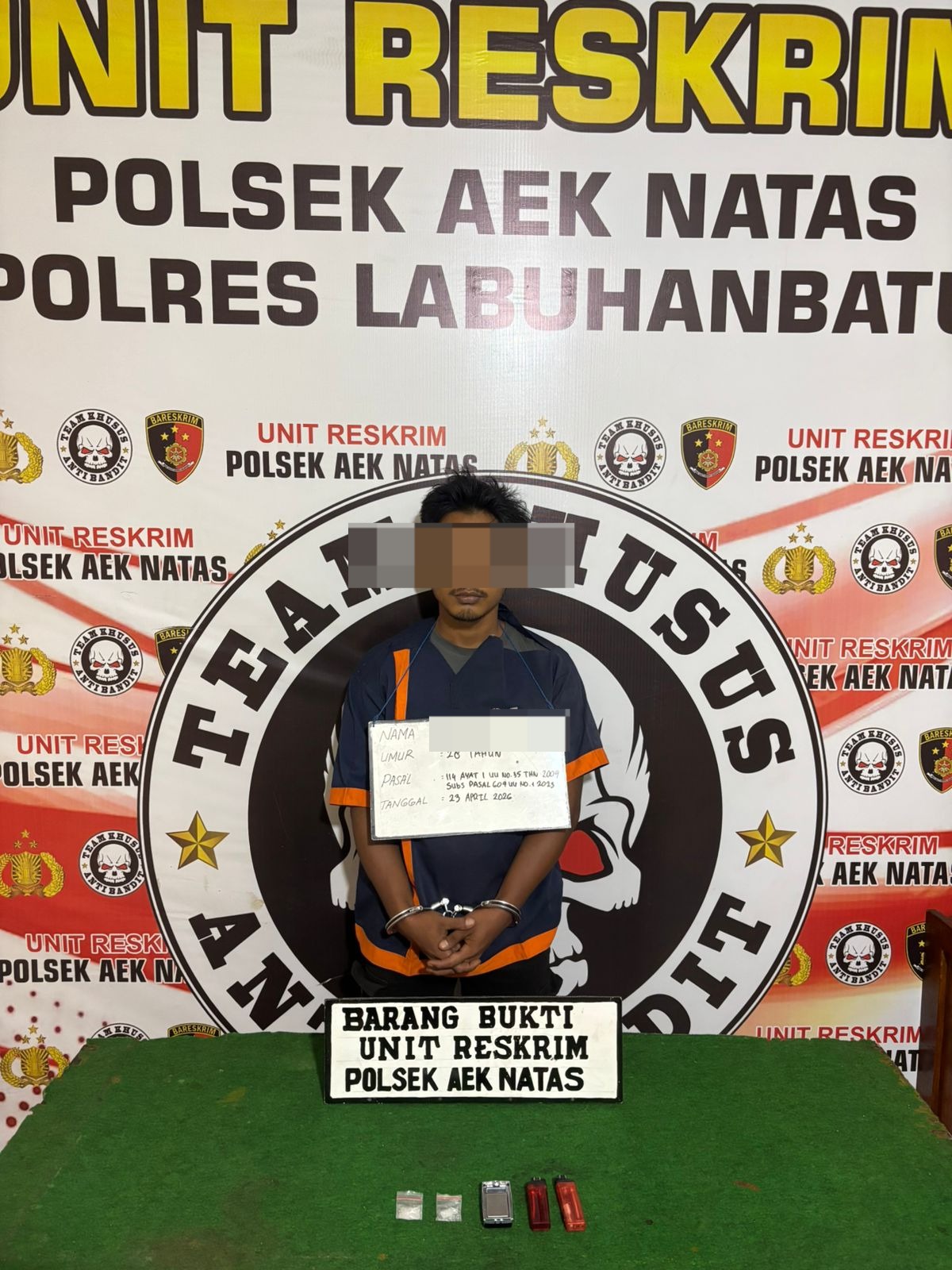 Tersangka diamankan petugas atas informasi dari masyarakat menyebutkan, sedang ada aktivitas transaksi narkotika di wilayah tersebut. Menindaklanjuti laporan itu, tim Opsnal Unit Reskrim langsung melakukan penyelidikan ke lokasi,ujar Kapolsek Aek Natas Iptu Sofysn SH